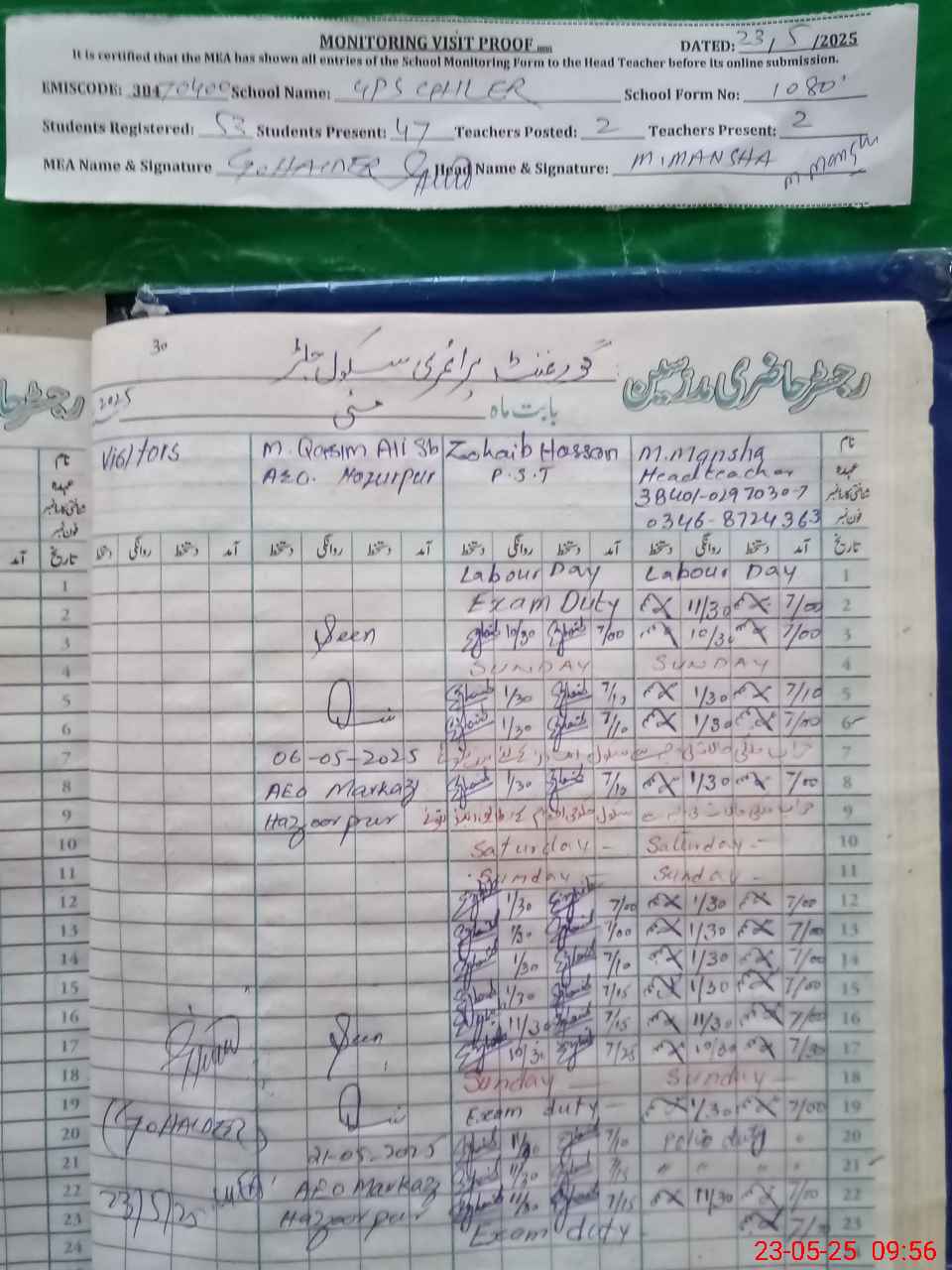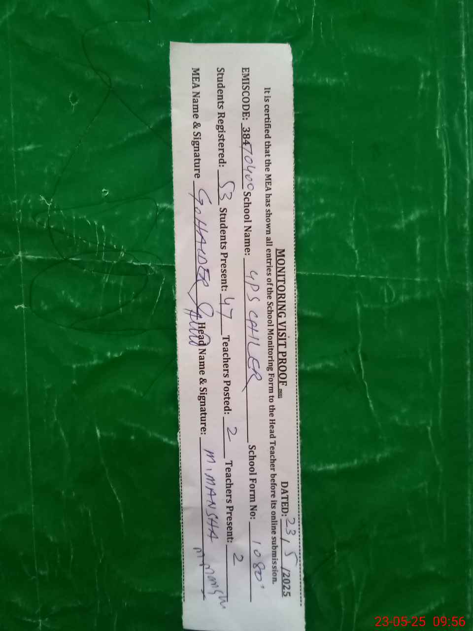 | Attendance Register | Head Teacher | MEA with School | Visit Proof |