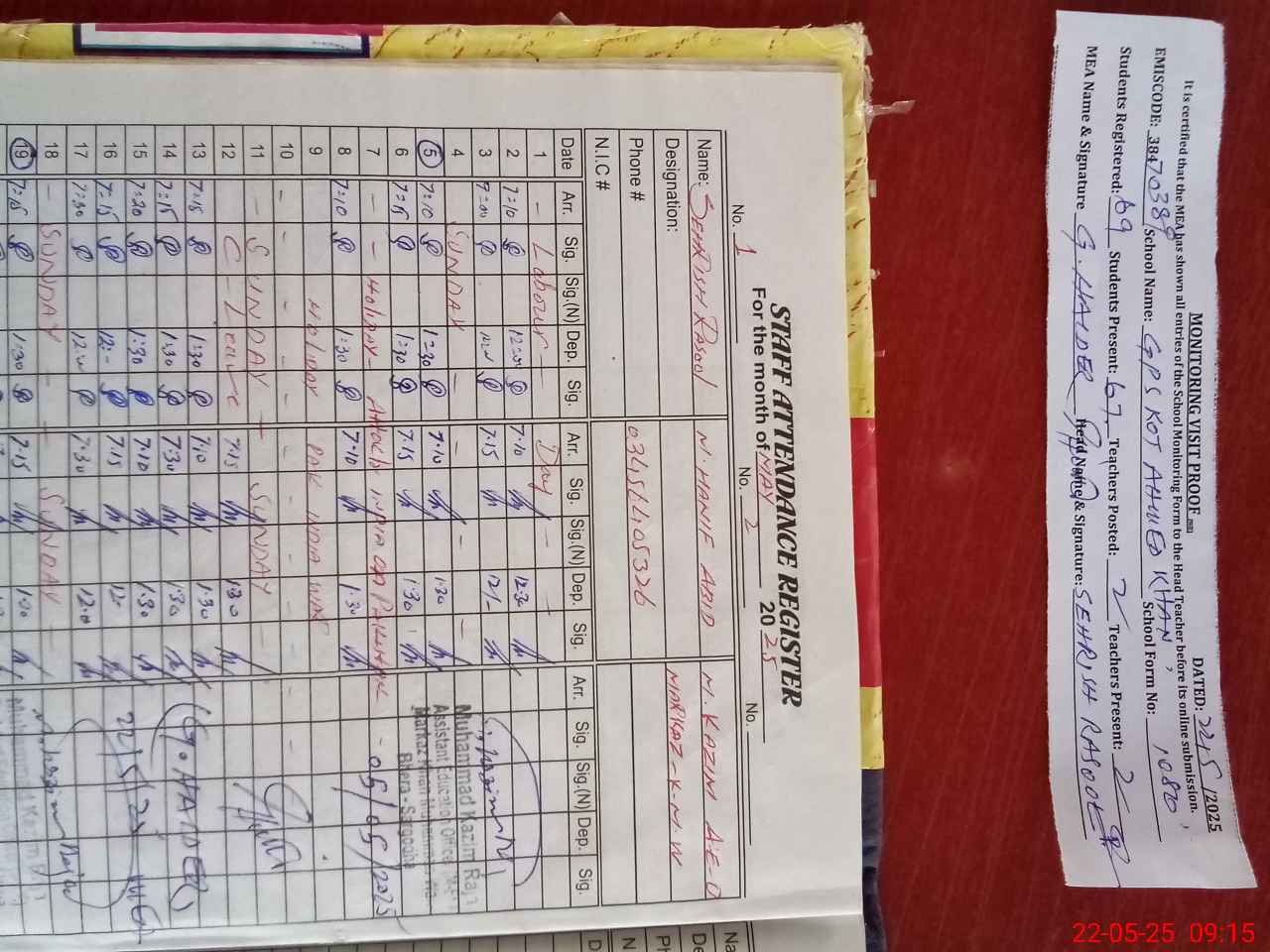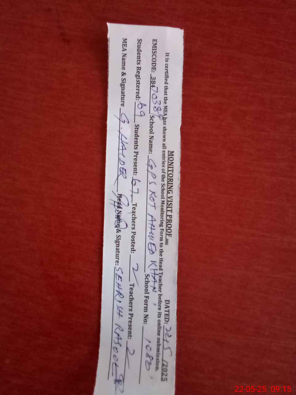 | Attendance Register | Head Teacher | MEA with School | Visit Proof |