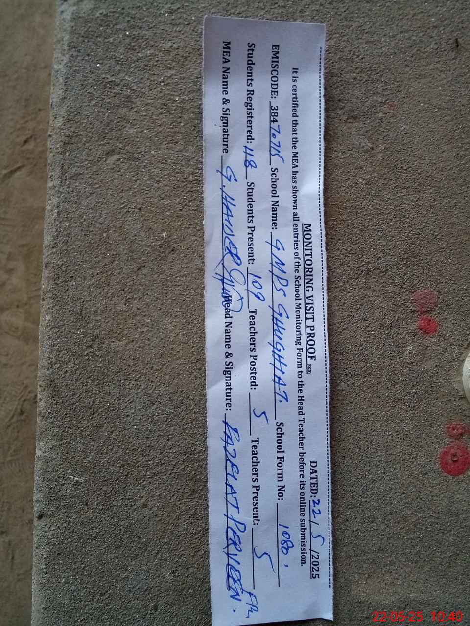| Attendance Register | Head Teacher | MEA with School | Visit Proof |