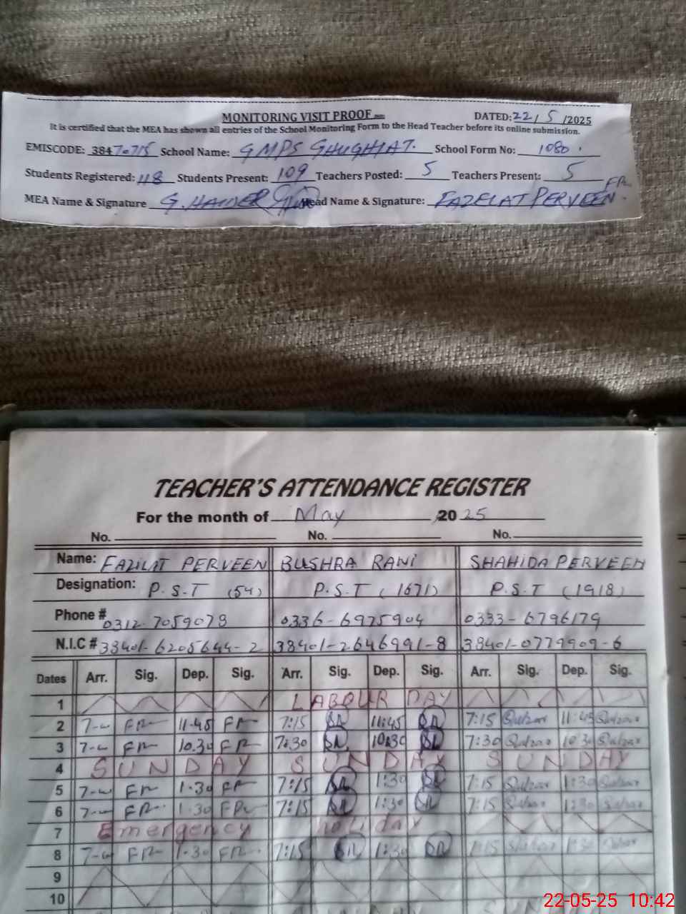 | Monitoring Date: 22-05-2025 | Start Time: 22-05-2025 10:15 AM | End Time: 22-05-2025 10:44 AM | Name of MEA: GH**** HA**** | |