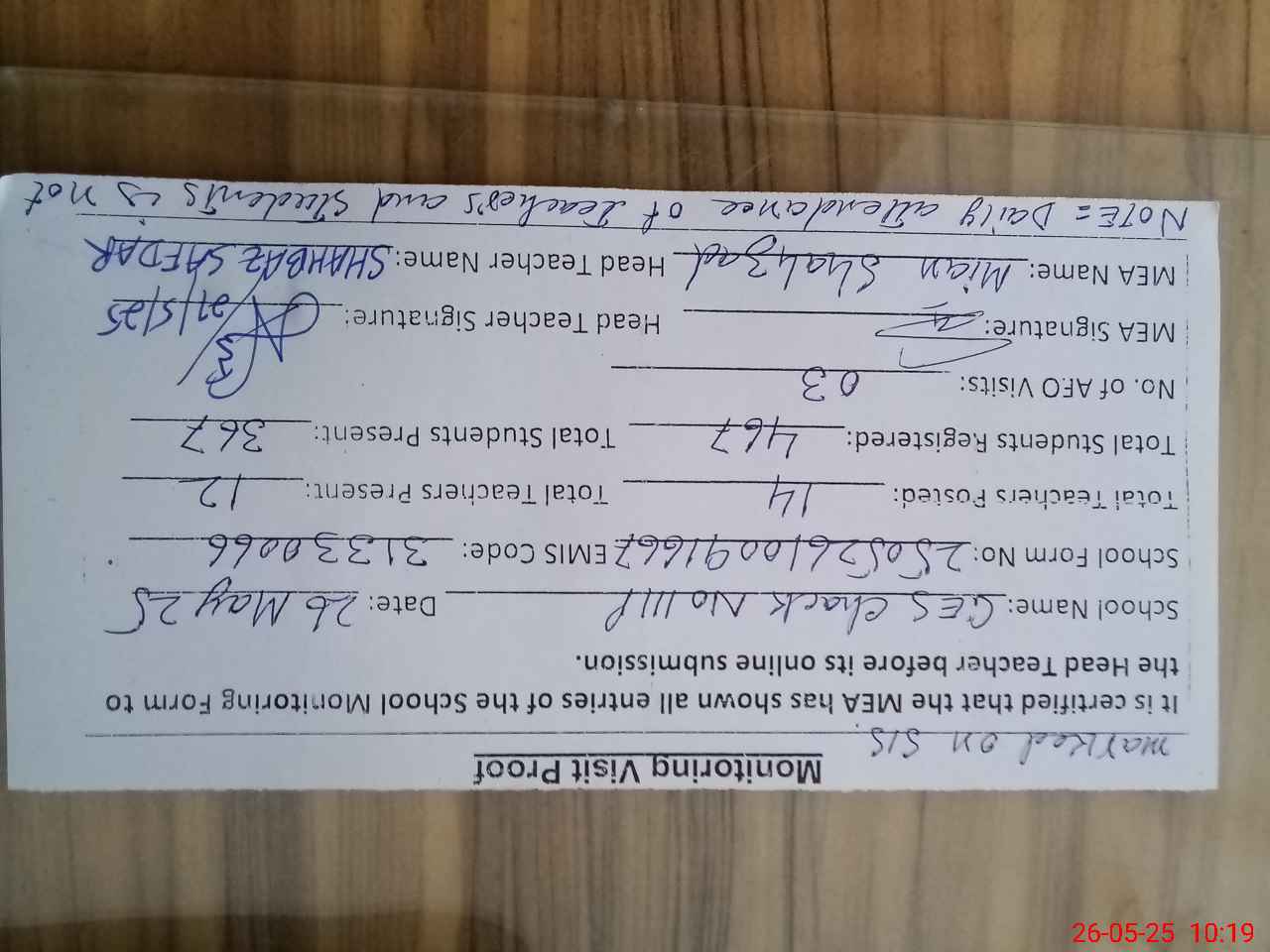 | Attendance Register | Head Teacher | MEA with School | Visit Proof |
