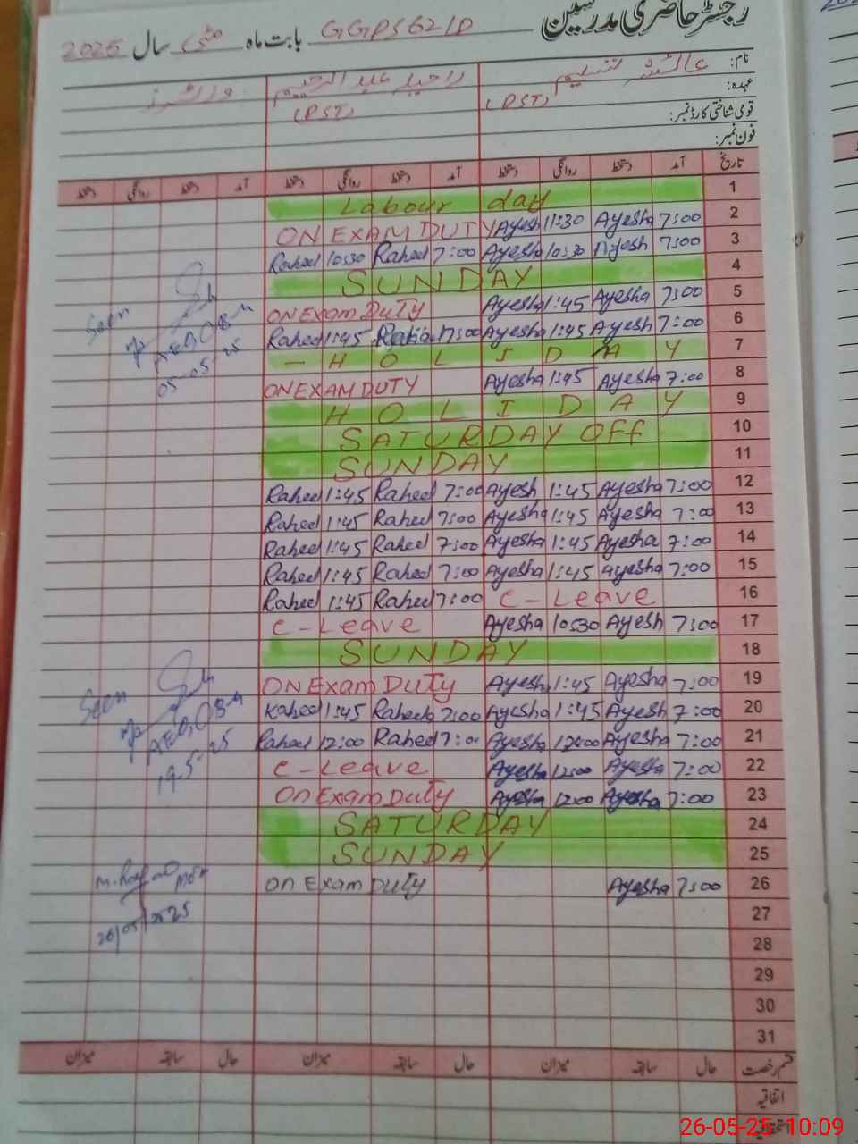 | 36**** | Ra**** Ab**** Ra**** | PST | Regular | 0 | 2 | 0 | 0 | 0 | 0 | 0 | 0 | 0 | Exam Duty |