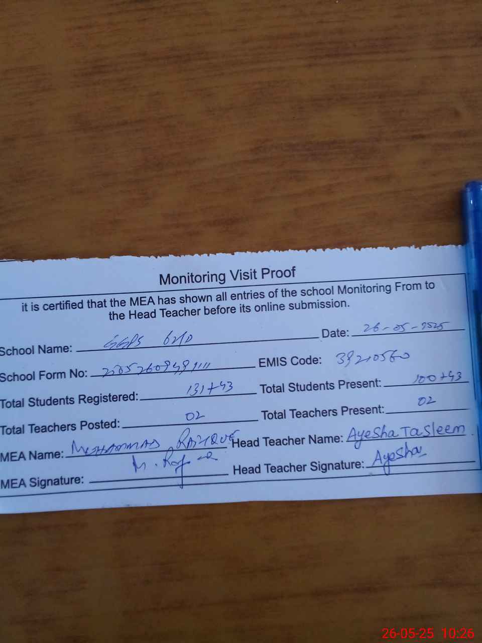 | Attendance Register | Head Teacher | MEA with School | Visit Proof |