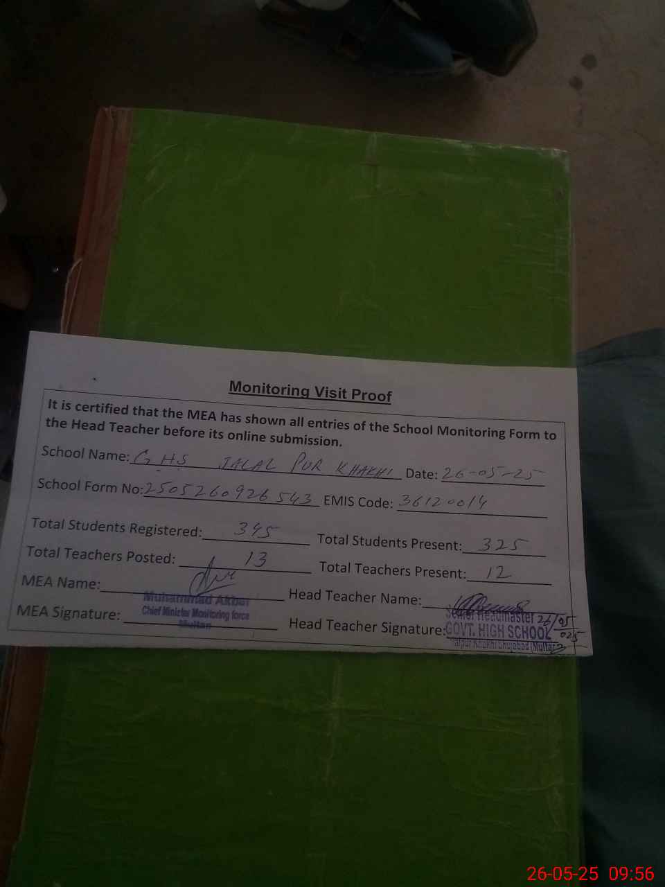 | Attendance Register | Head Teacher | MEA with School | Visit Proof |