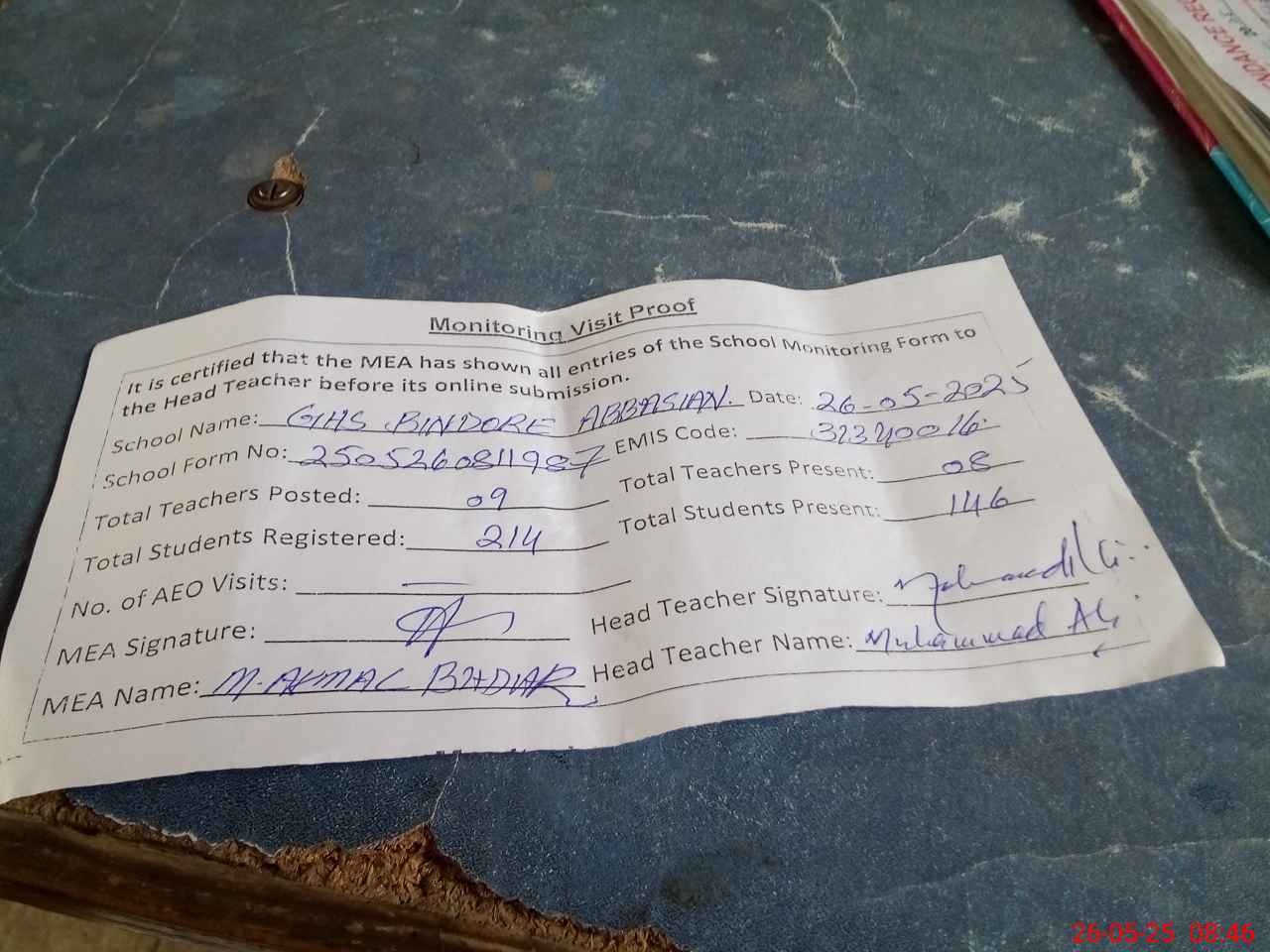 | Attendance Register | Head Teacher | MEA with School | Visit Proof |