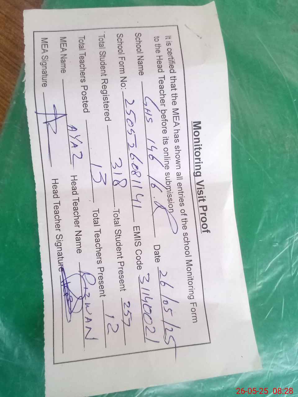 | Attendance Register | Head Teacher | MEA with School | Visit Proof |