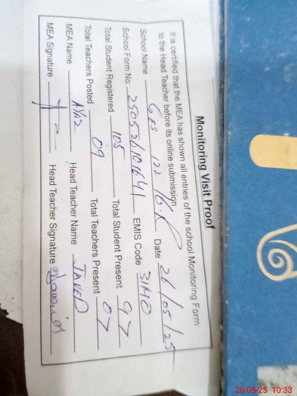 | Attendance Register | Head Teacher | MEA with School | Visit Proof |