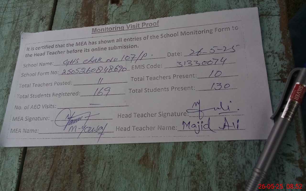 | EMIS Code: 31330074 | Name of School: GHS CHAK NO.107/P | |||