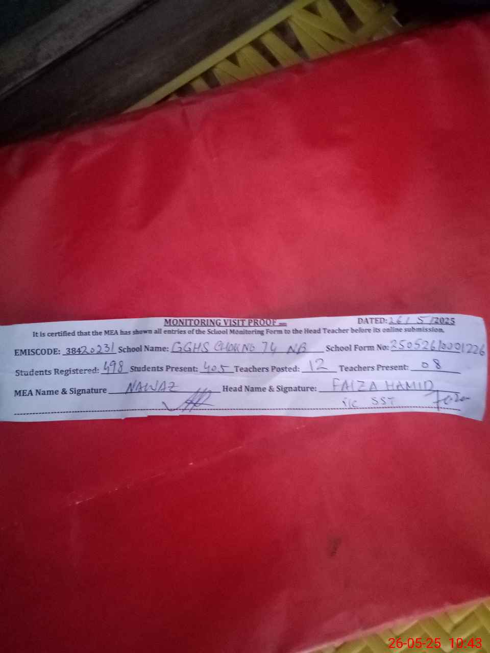 | Attendance Register | Head Teacher | MEA with School | Visit Proof |