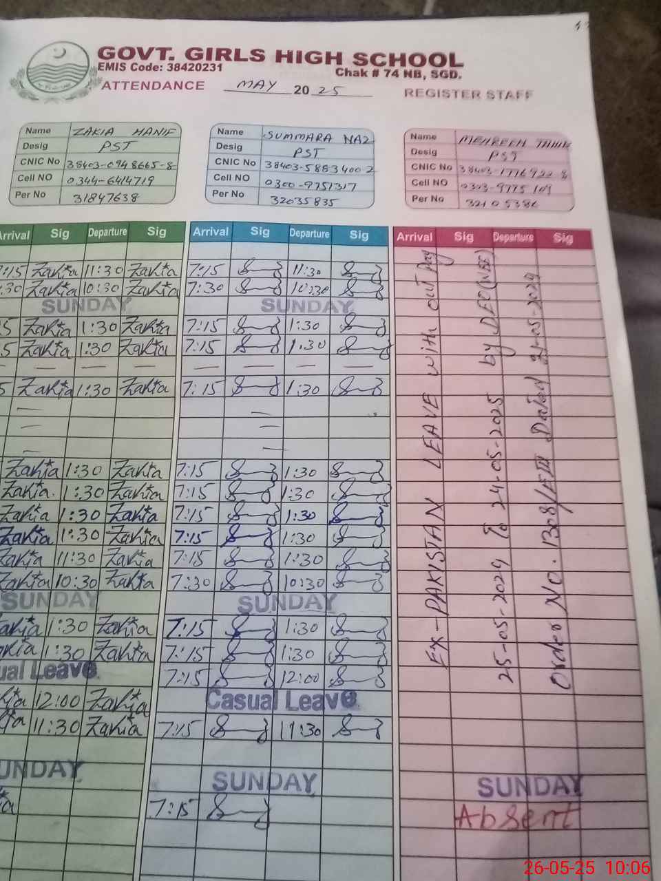 | CNIC | Full Name | Designation | R/C | Absence during last cal. month |