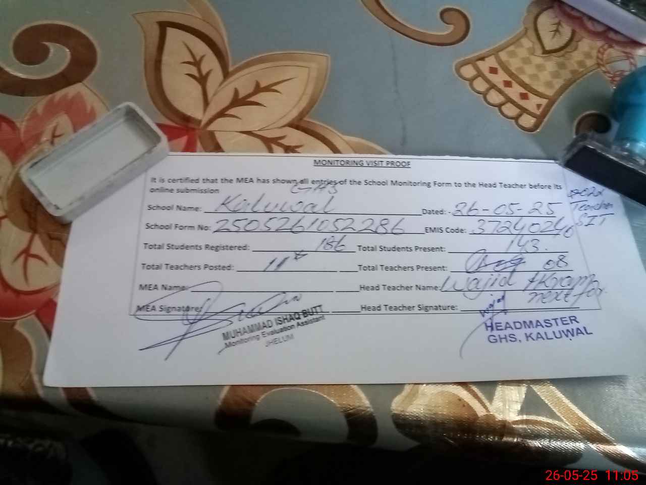 | EMIS Code: 37240240 | Name of School: GHS KALUWAL | |||