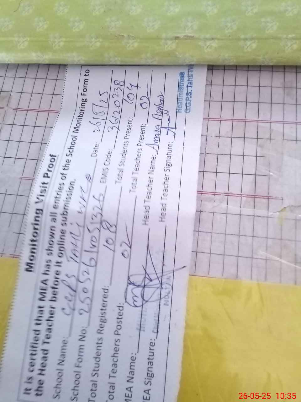 | Attendance Register | Head Teacher | MEA with School | Visit Proof |