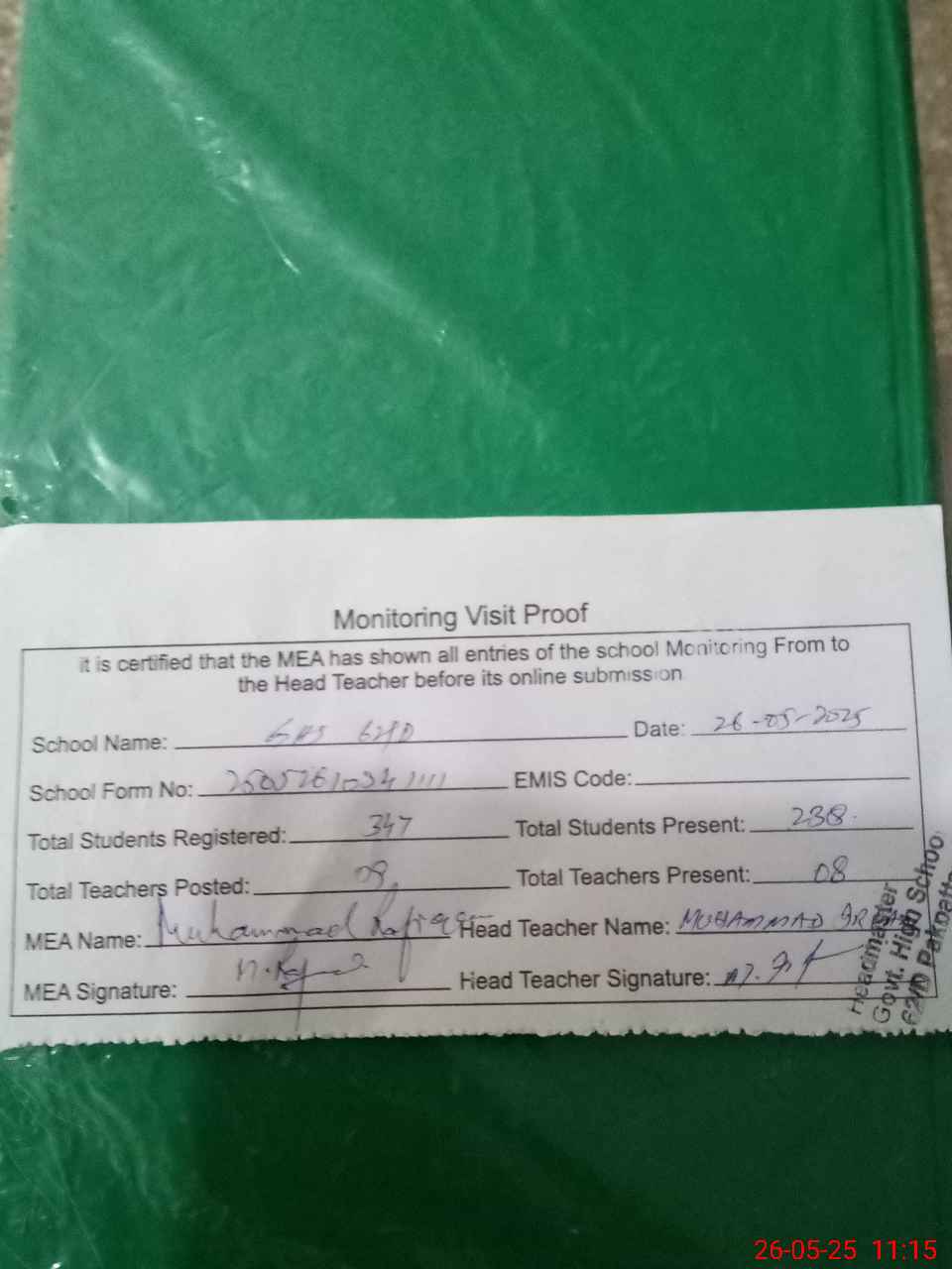 | Attendance Register | Head Teacher | MEA with School | Visit Proof |