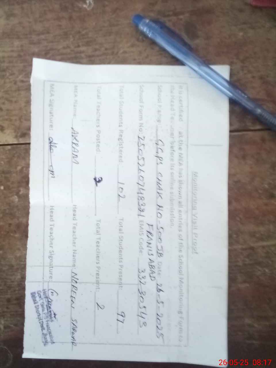 | Attendance Register | Head Teacher | MEA with School | Visit Proof |
