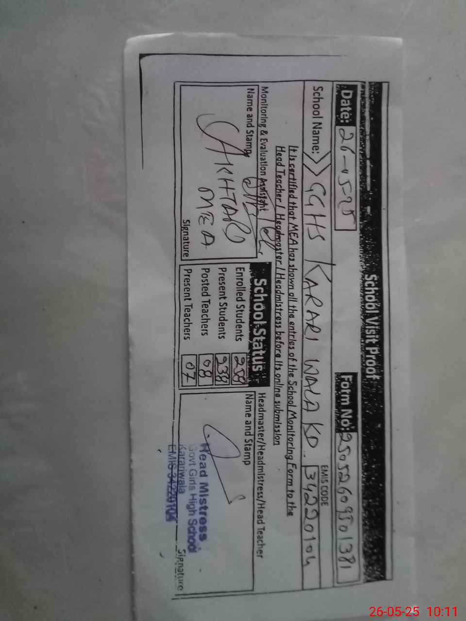 | Certified that this School was Inspected by the Undersigned MEA/DMO Today and the Information Stated Above is as Per Record. | |||||