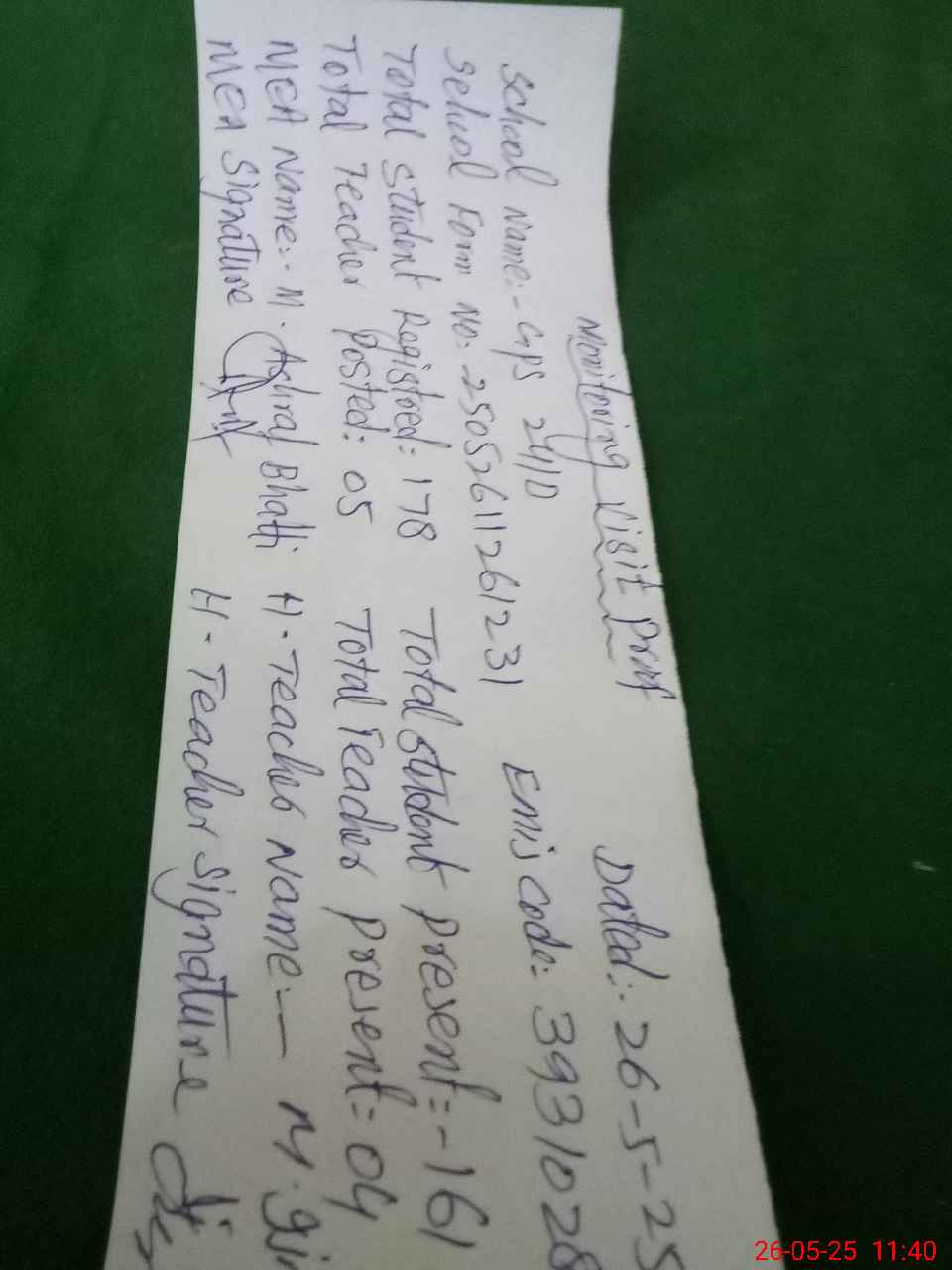 | Attendance Register | Head Teacher | MEA with School | Visit Proof |