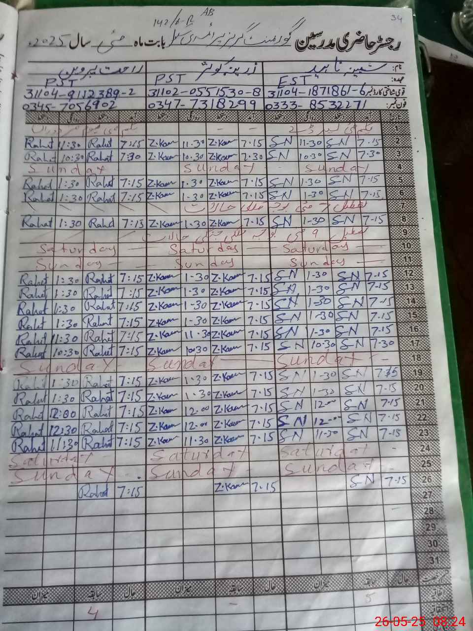 | CNIC | Full Name | Designation | R/C | Absence During Last Calender Month |