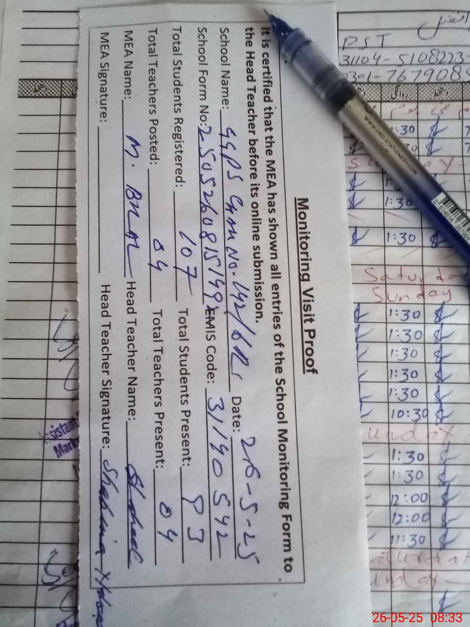 | Attendance Register | Head Teacher | MEA with School | Visit Proof |