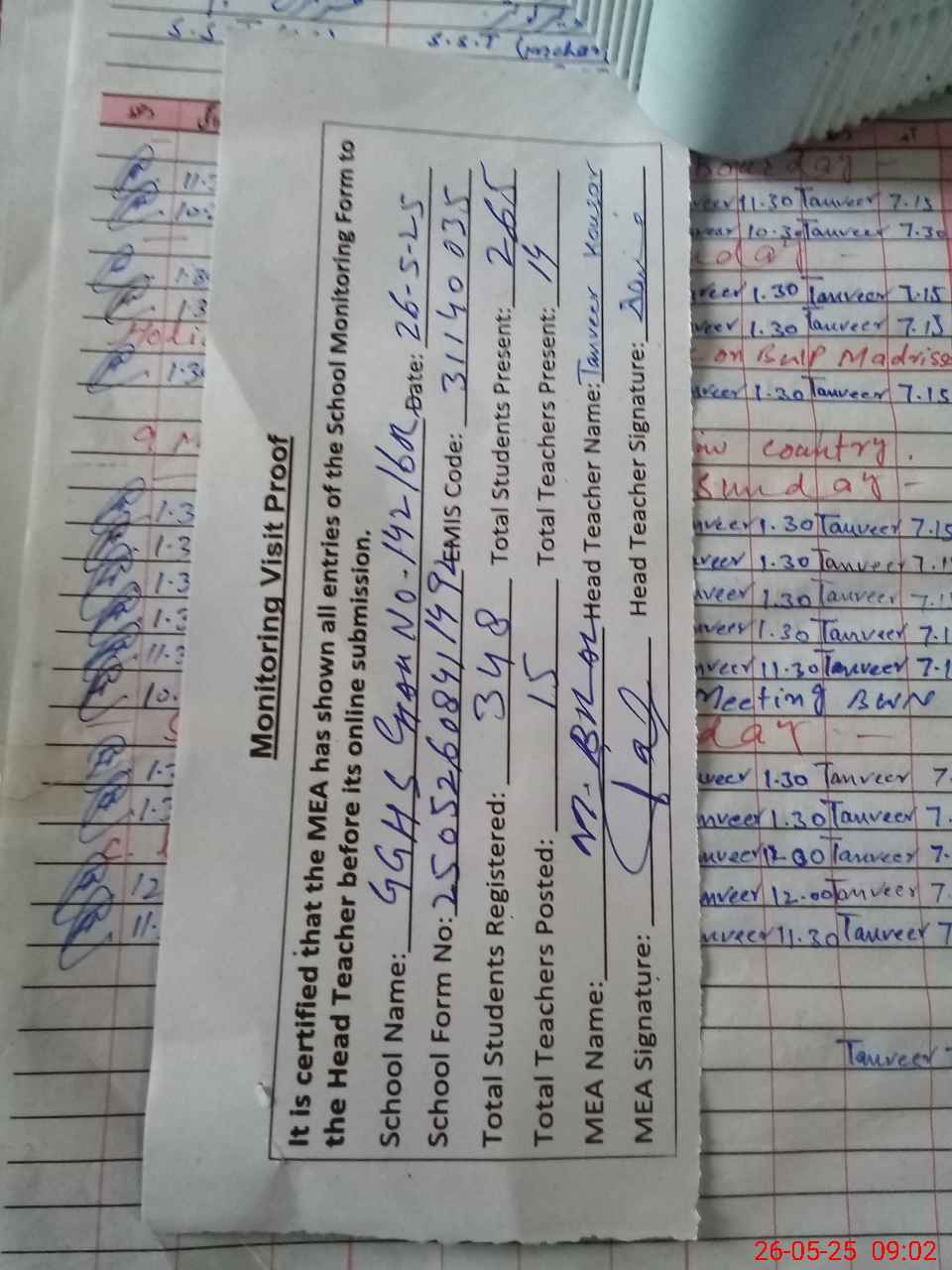 | Attendance Register | Head Teacher | MEA with School | Visit Proof |