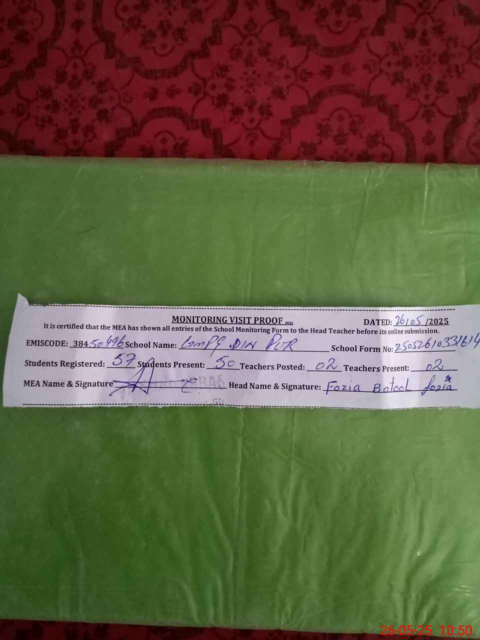 | Attendance Register | Head Teacher | MEA with School | Visit Proof |