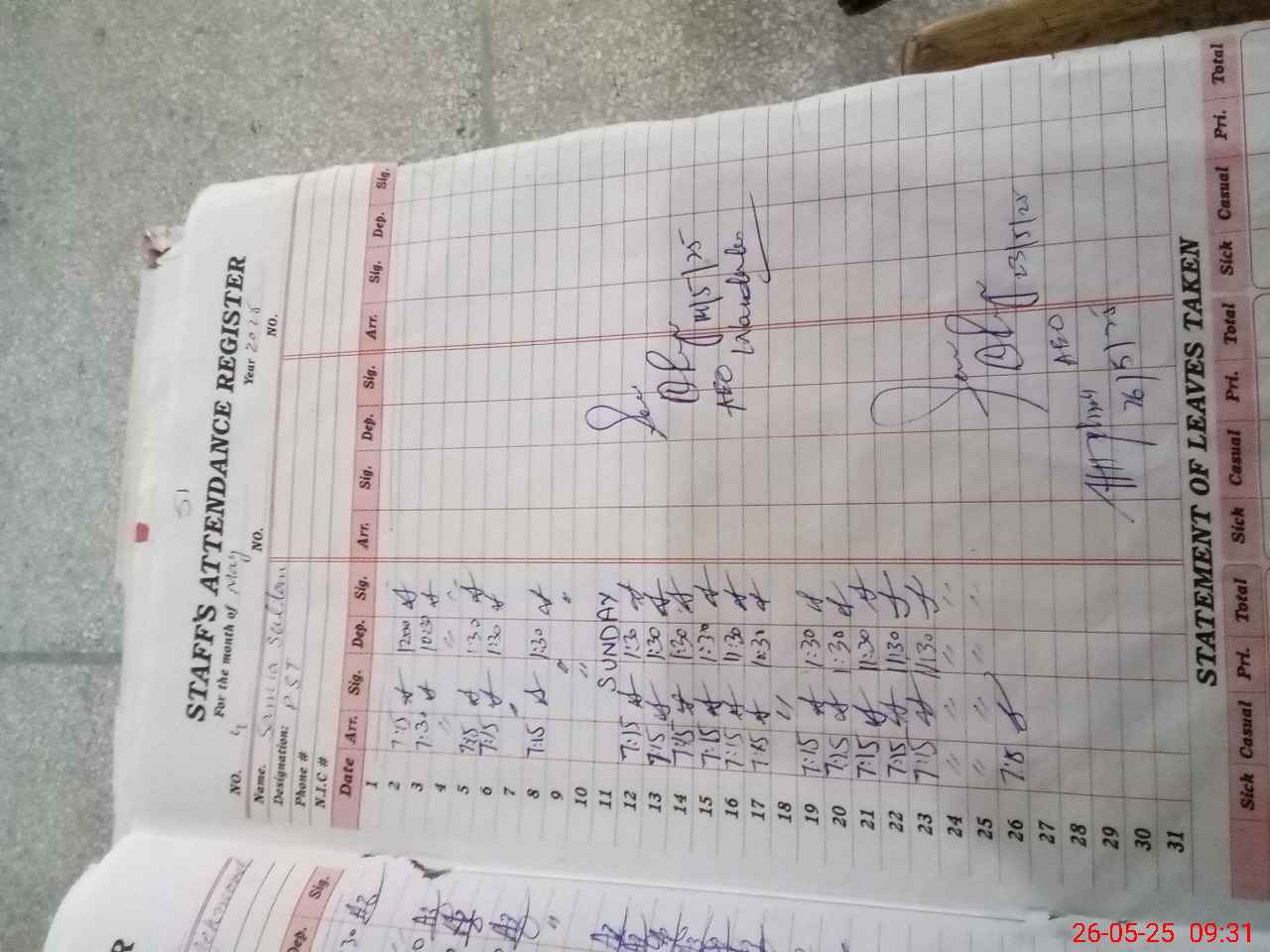 | CNIC | Full Name | Designation | R/C | Absence During Last Calender Month |