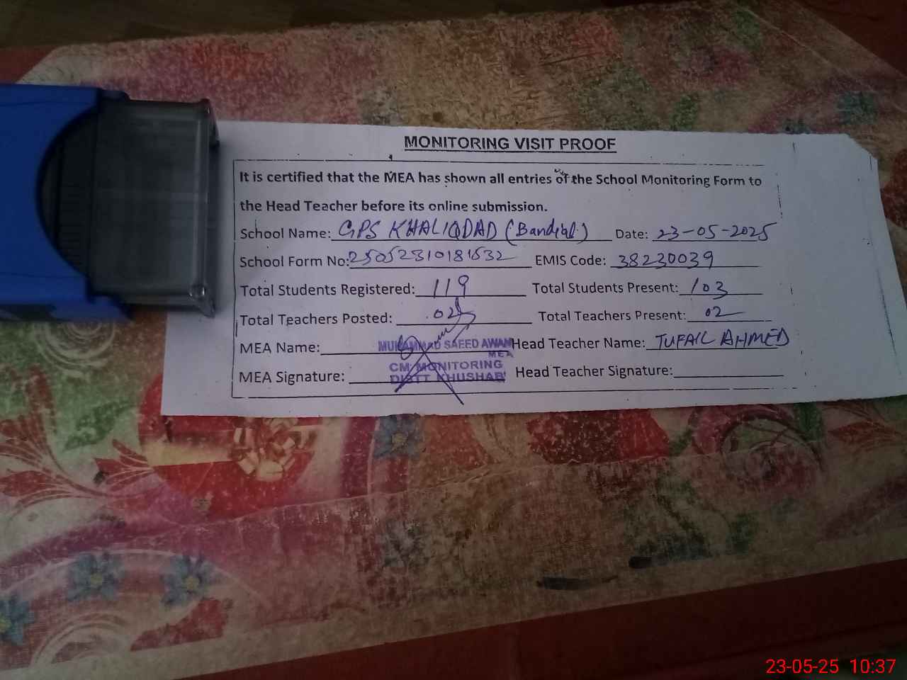 | EMIS Code: 38230039 | Name of School: GPS KHALIQ DAD BANDIAL | |||