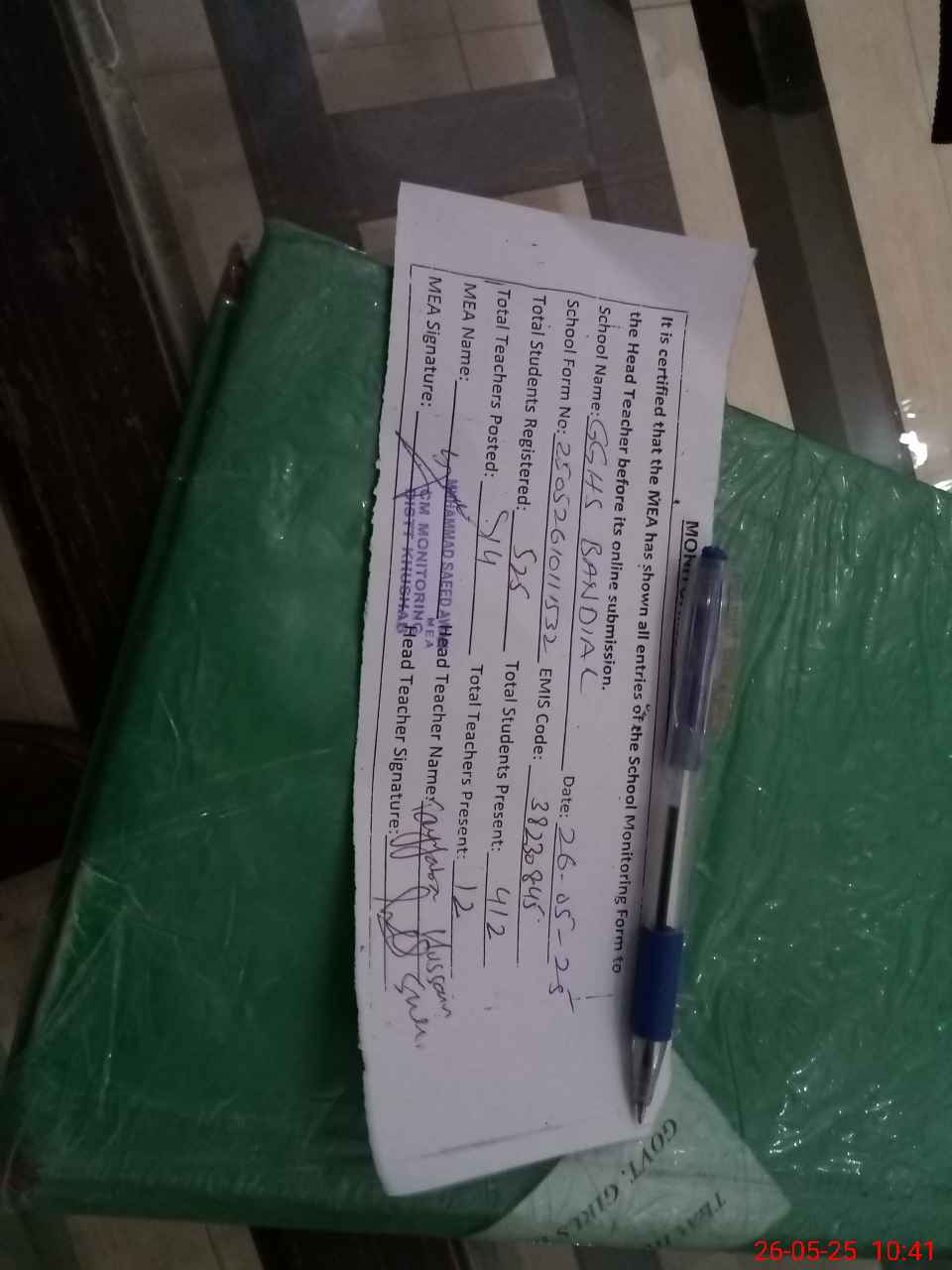 | Certified that this School was Inspected by the Undersigned MEA/DMO Today and the Information Stated Above is as Per Record. | |||||