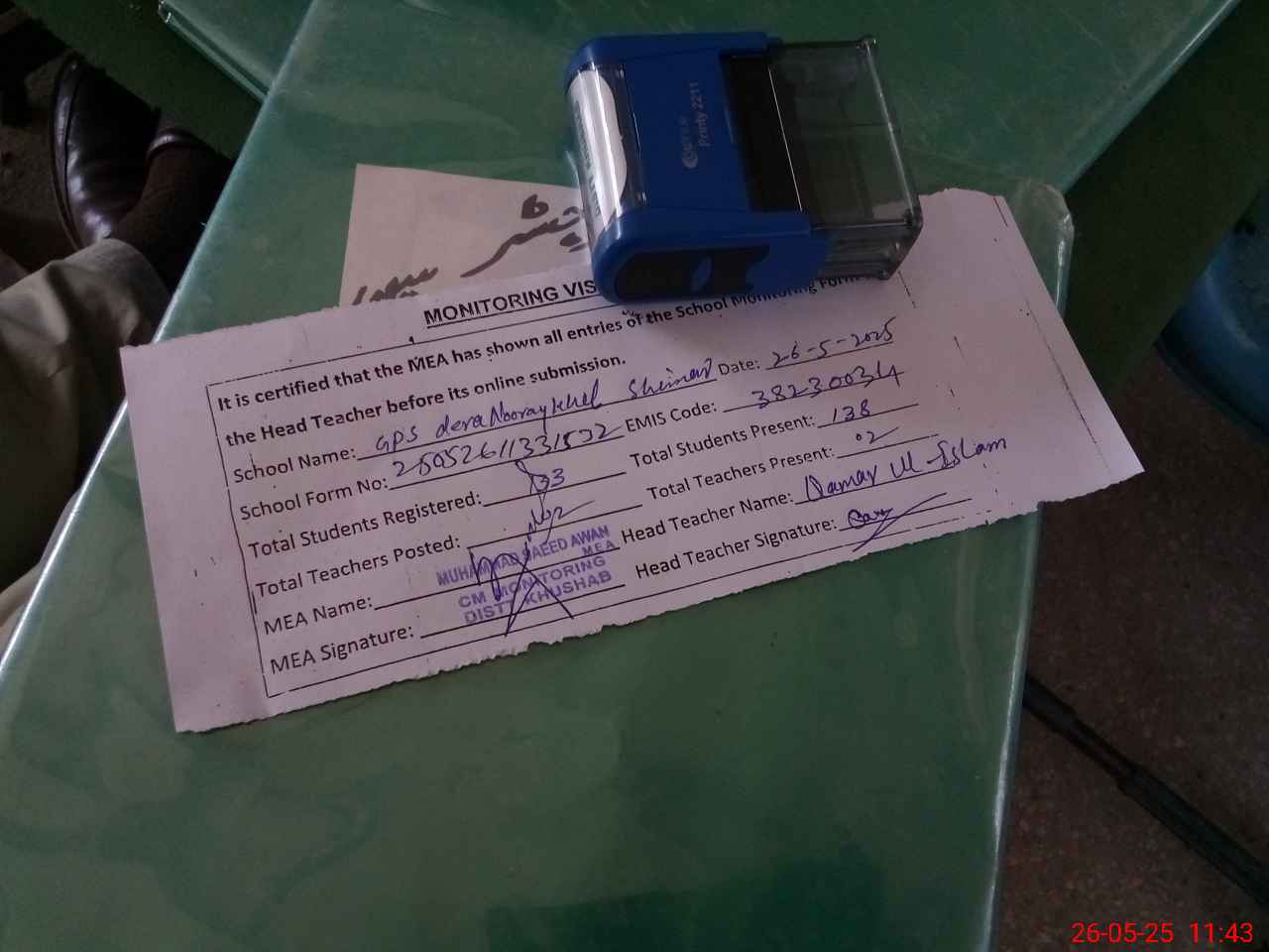 | Attendance Register | Head Teacher | MEA with School | Visit Proof |