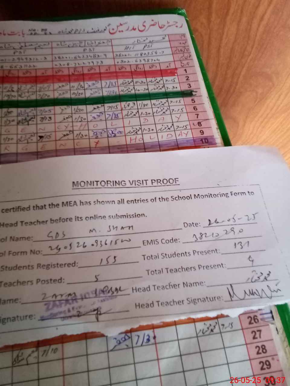 | Attendance Register | Head Teacher | MEA with School | Visit Proof |