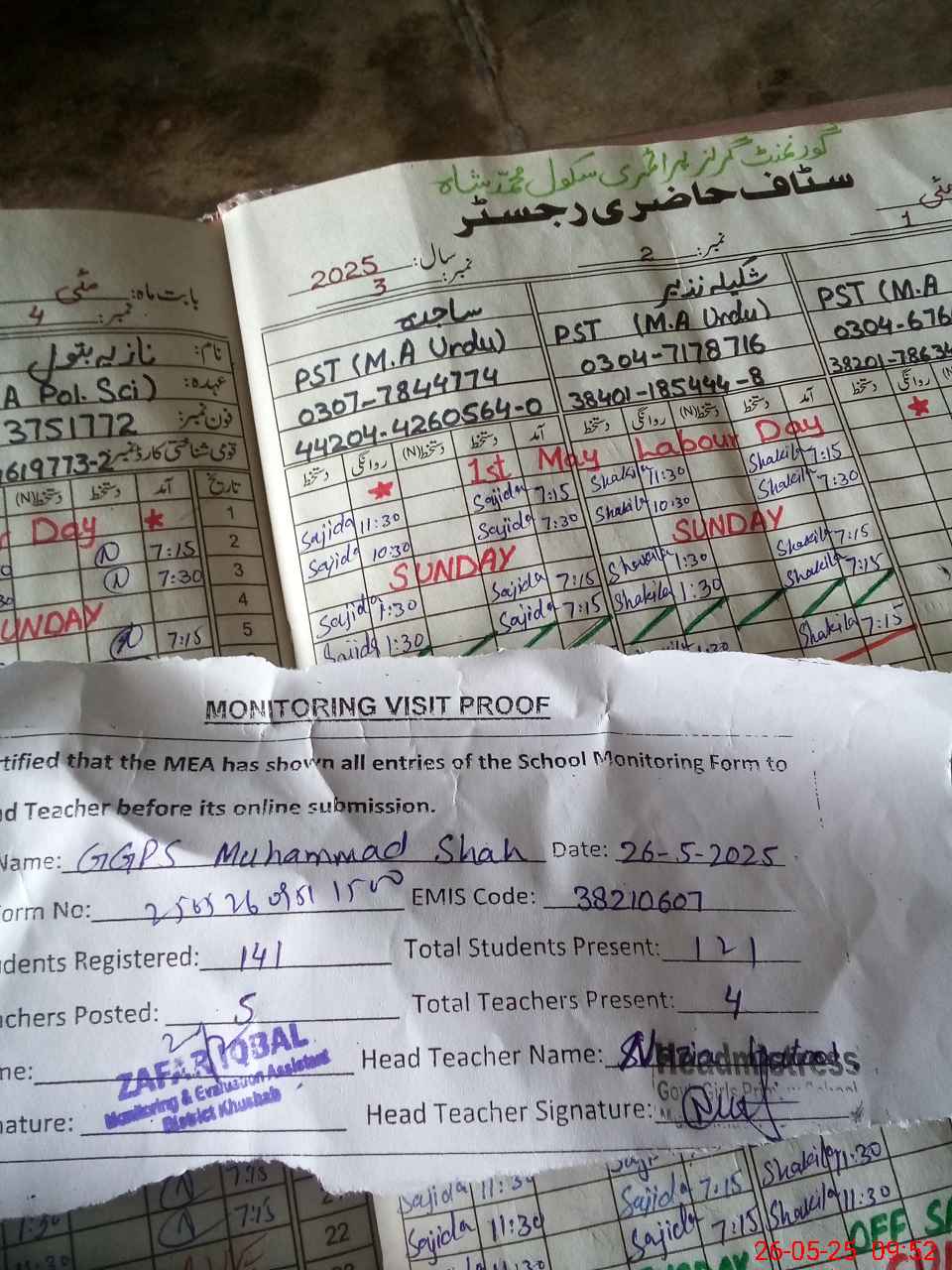 | Attendance Register | Head Teacher | MEA with School | Visit Proof |