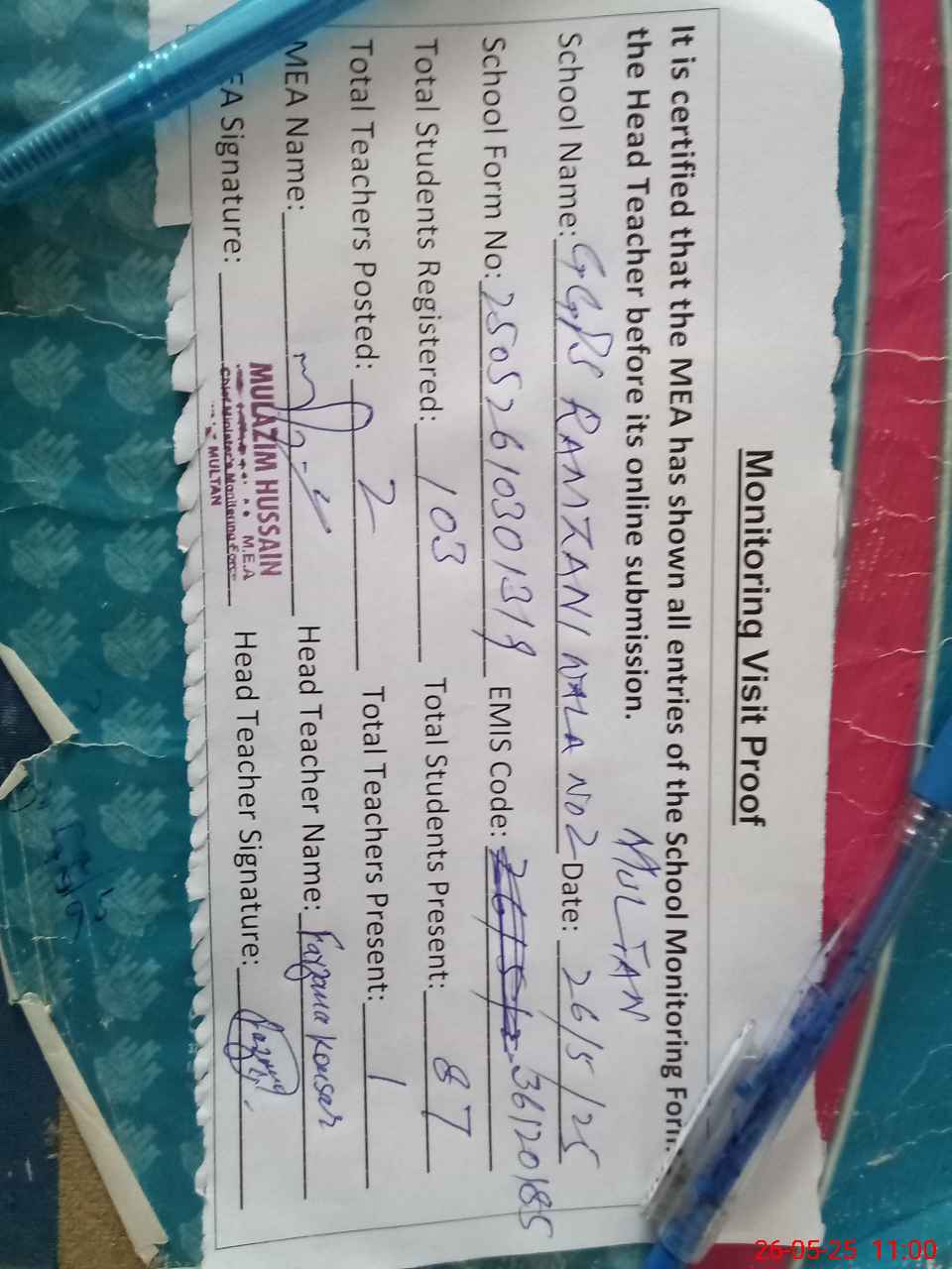 | Attendance Register | Head Teacher | MEA with School | Visit Proof |