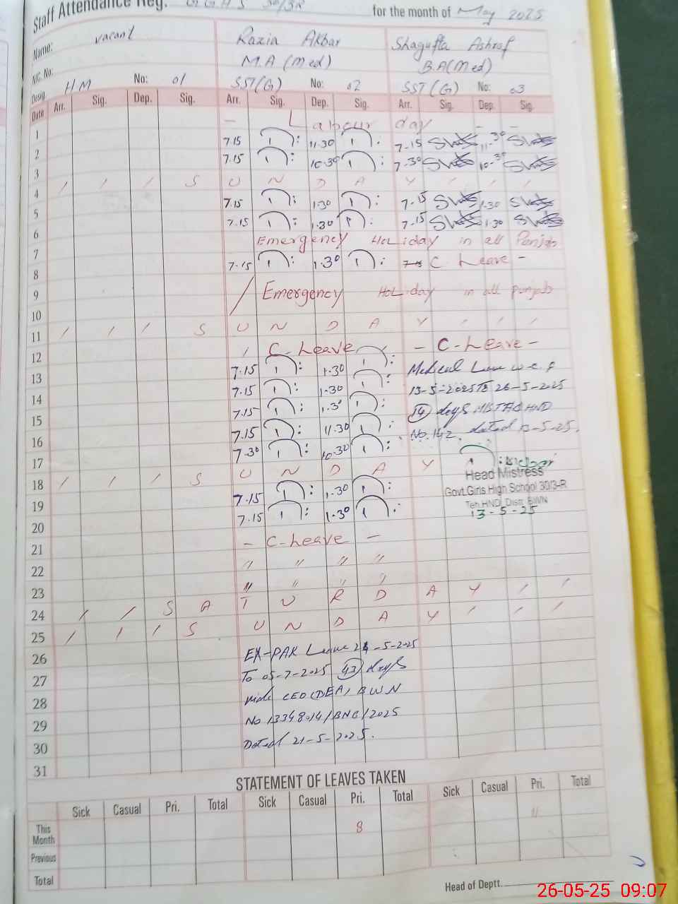 | Leave | Duty | Absent | Maternity | Medical | Ex- Pak |