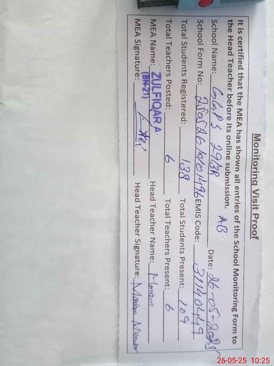 | Attendance Register | Head Teacher | MEA with School | Visit Proof |