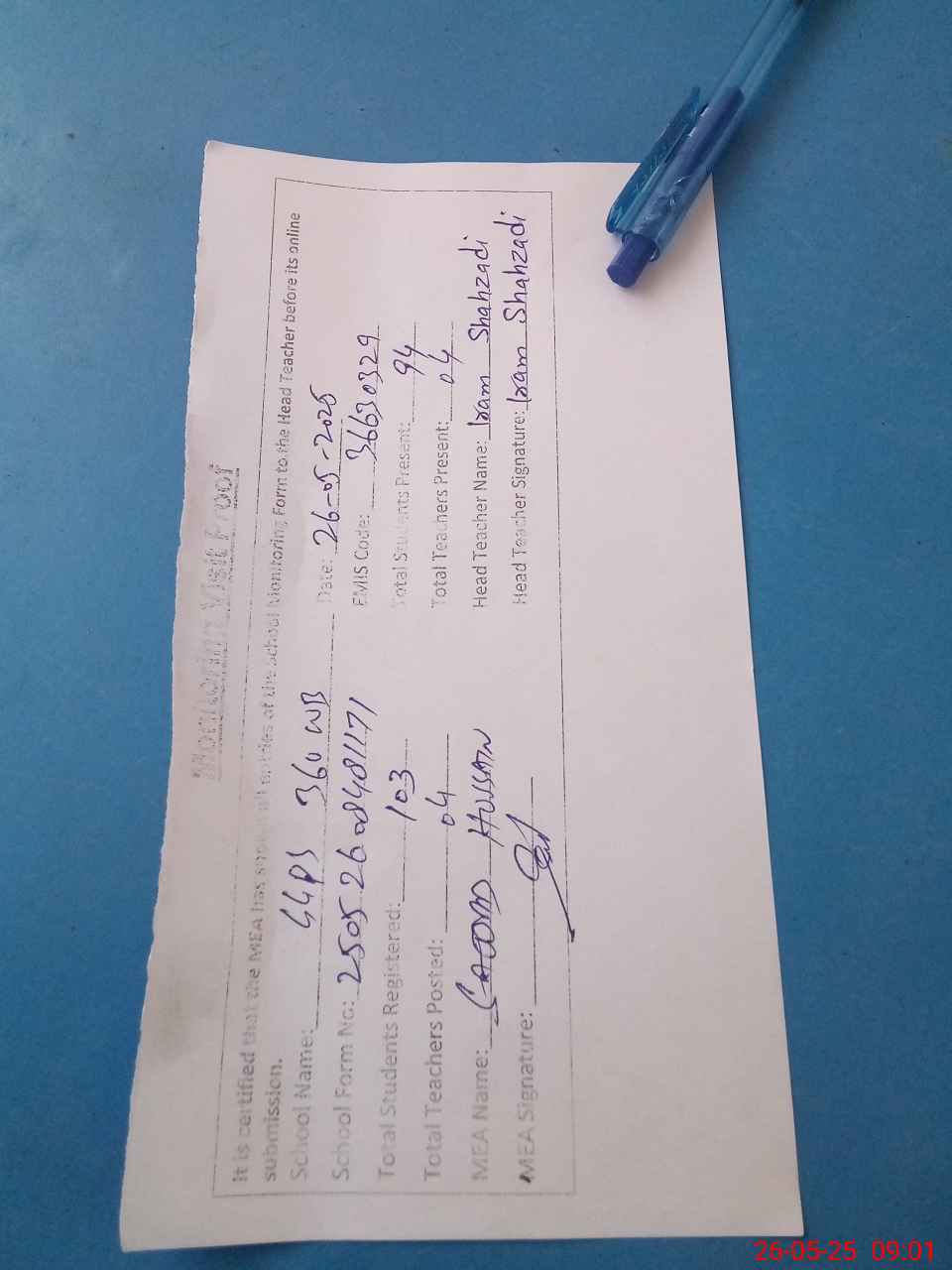 | Attendance Register | Head Teacher | MEA with School | Visit Proof |
