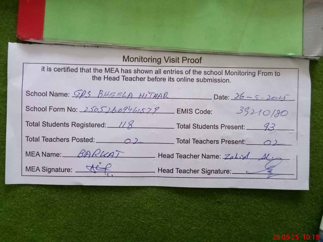 | EMIS Code: 39210180 | Name of School: GPS BHEELA HITHAR | |||