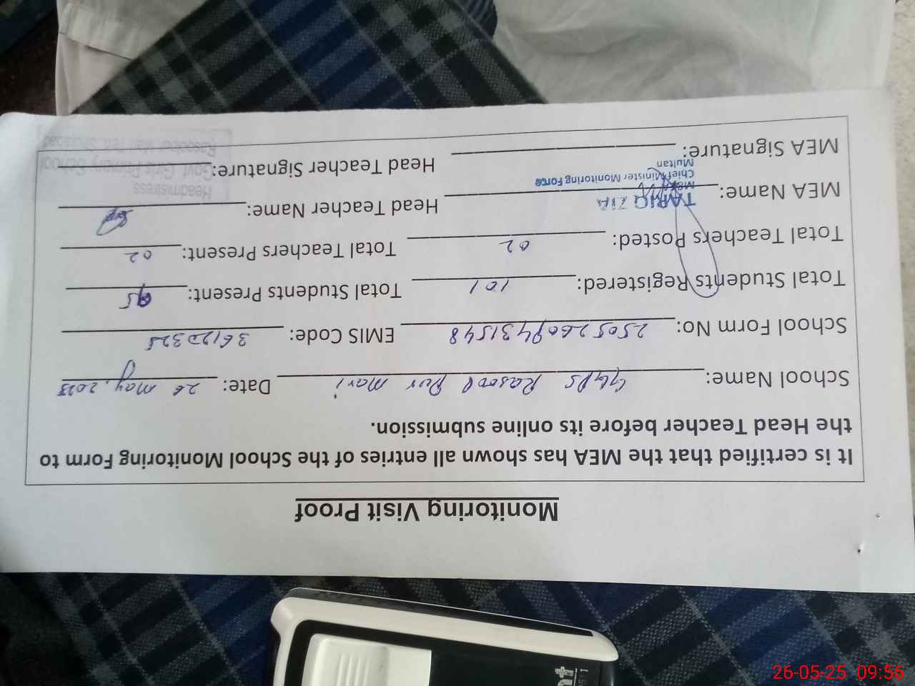 | Attendance Register | Head Teacher | MEA with School | Visit Proof |
