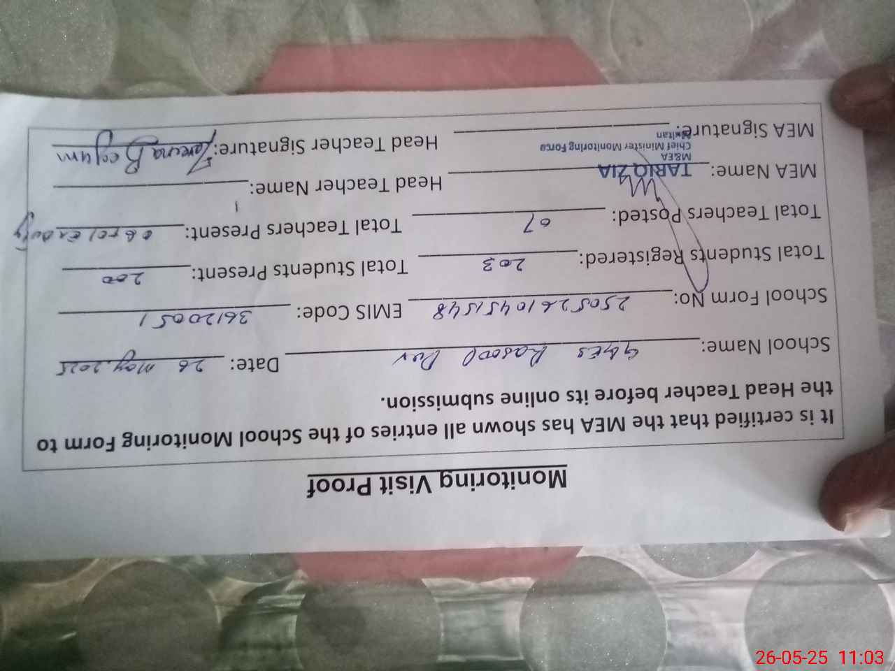 | Attendance Register | Head Teacher | MEA with School | Visit Proof |