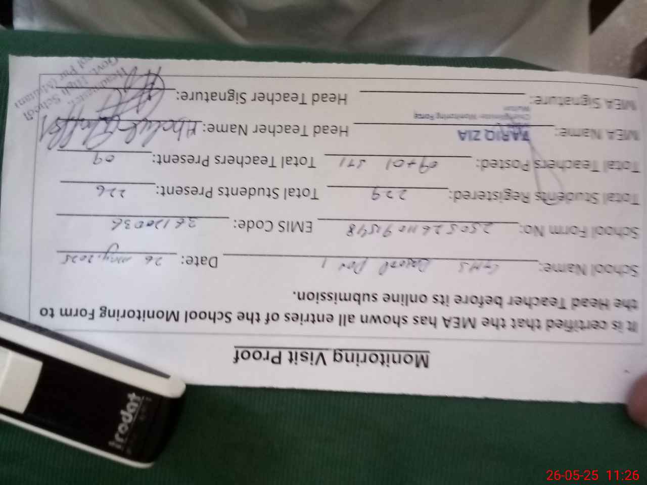 | Attendance Register | Head Teacher | MEA with School | Visit Proof |