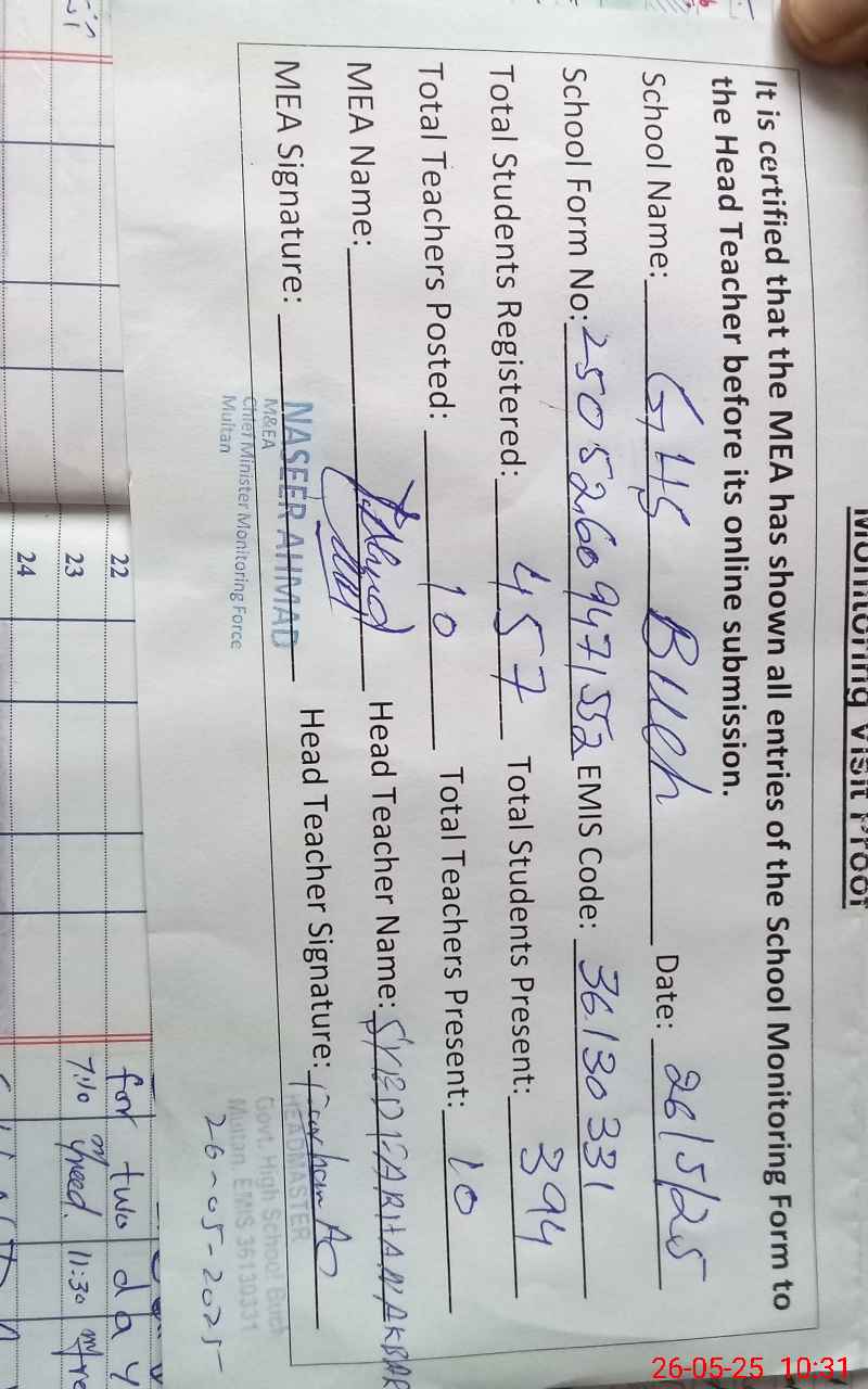 | Certified that this School was Inspected by the Undersigned MEA/DMO Today and the Information Stated Above is as Per Record. | |||||