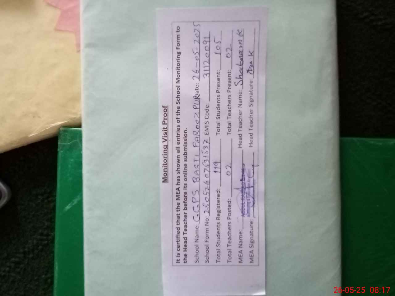 | Attendance Register | Head Teacher | MEA with School | Visit Proof |