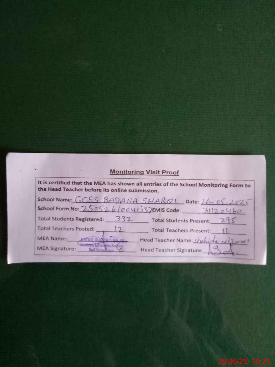 | Attendance Register | Head Teacher | MEA with School | Visit Proof |