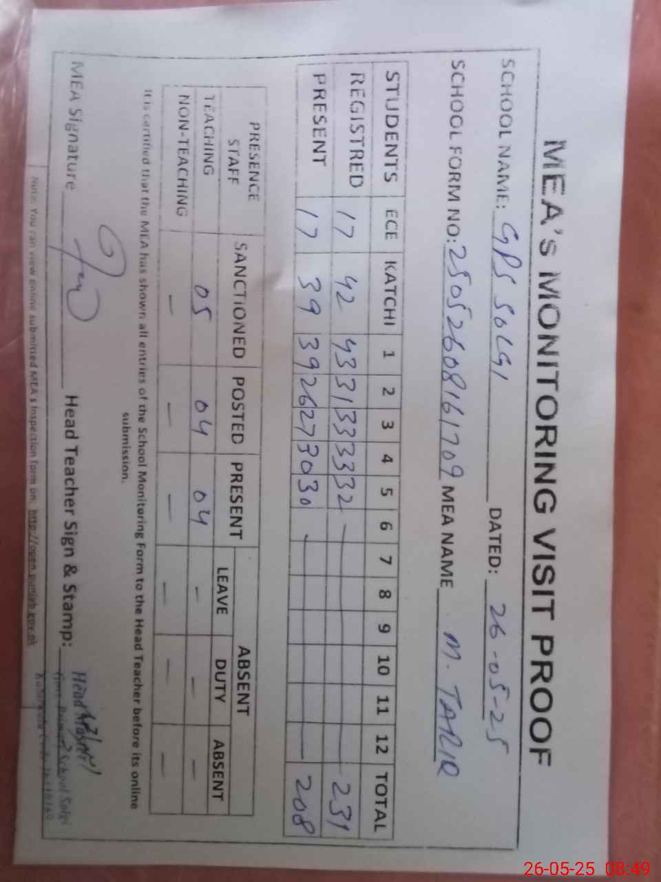 | Attendance Register | Head Teacher | MEA with School | Visit Proof |