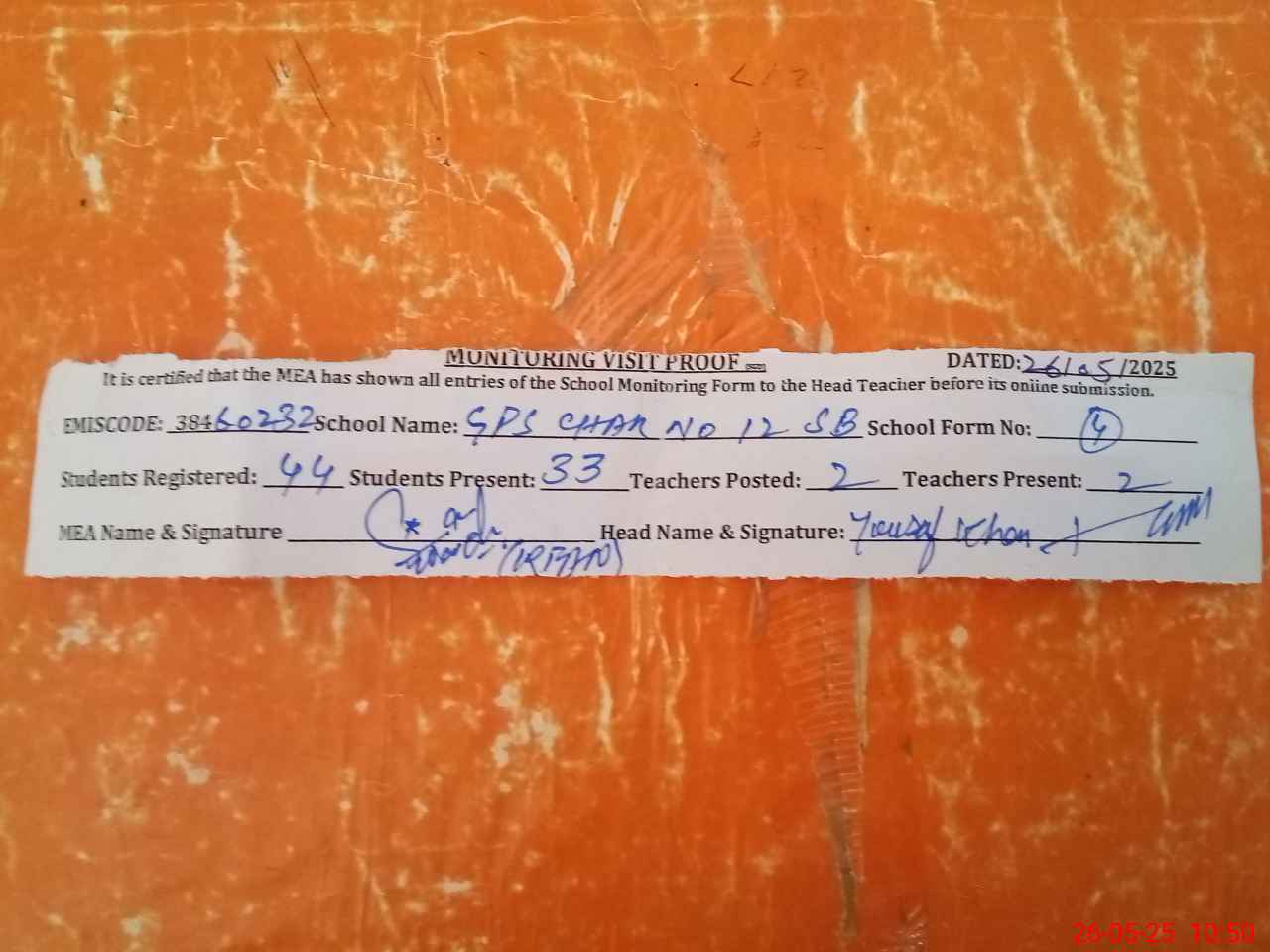 | EMIS Code: 38460232 | Name of School: GPS CHAK NO.12 SB | |||