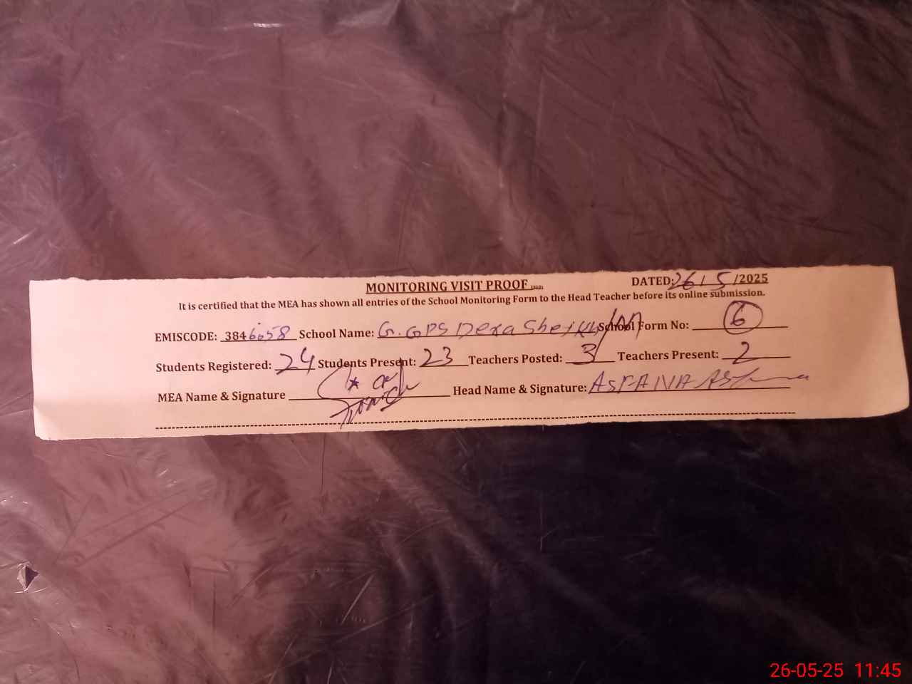 | Attendance Register | Head Teacher | MEA with School | Visit Proof |