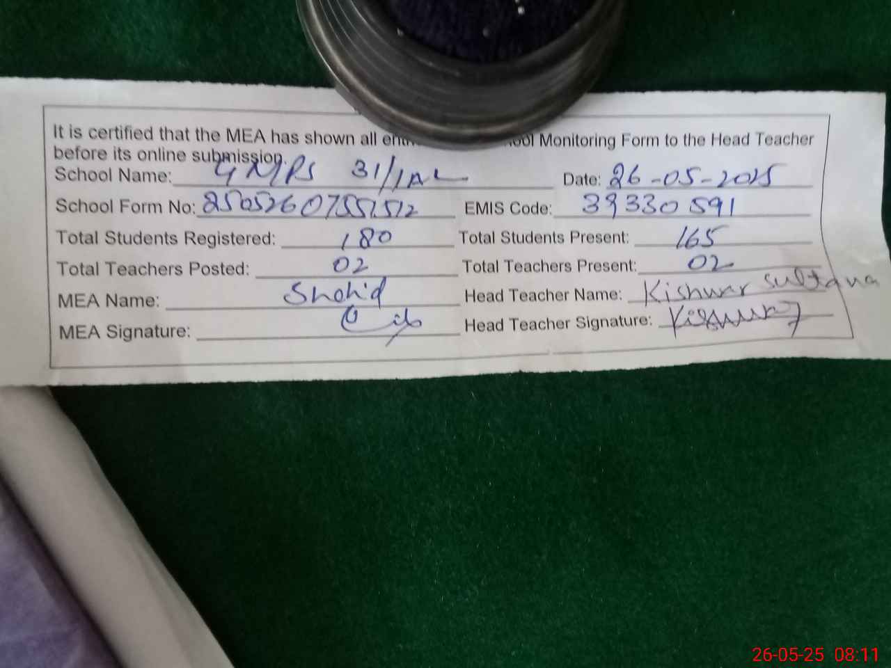 | Attendance Register | Head Teacher | MEA with School | Visit Proof |