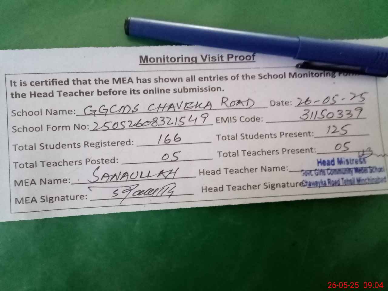 | Attendance Register | Head Teacher | MEA with School | Visit Proof |