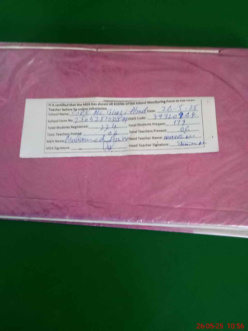 | Certified that this School was Inspected by the Undersigned MEA/DMO Today and the Information Stated Above is as Per Record. | |||||