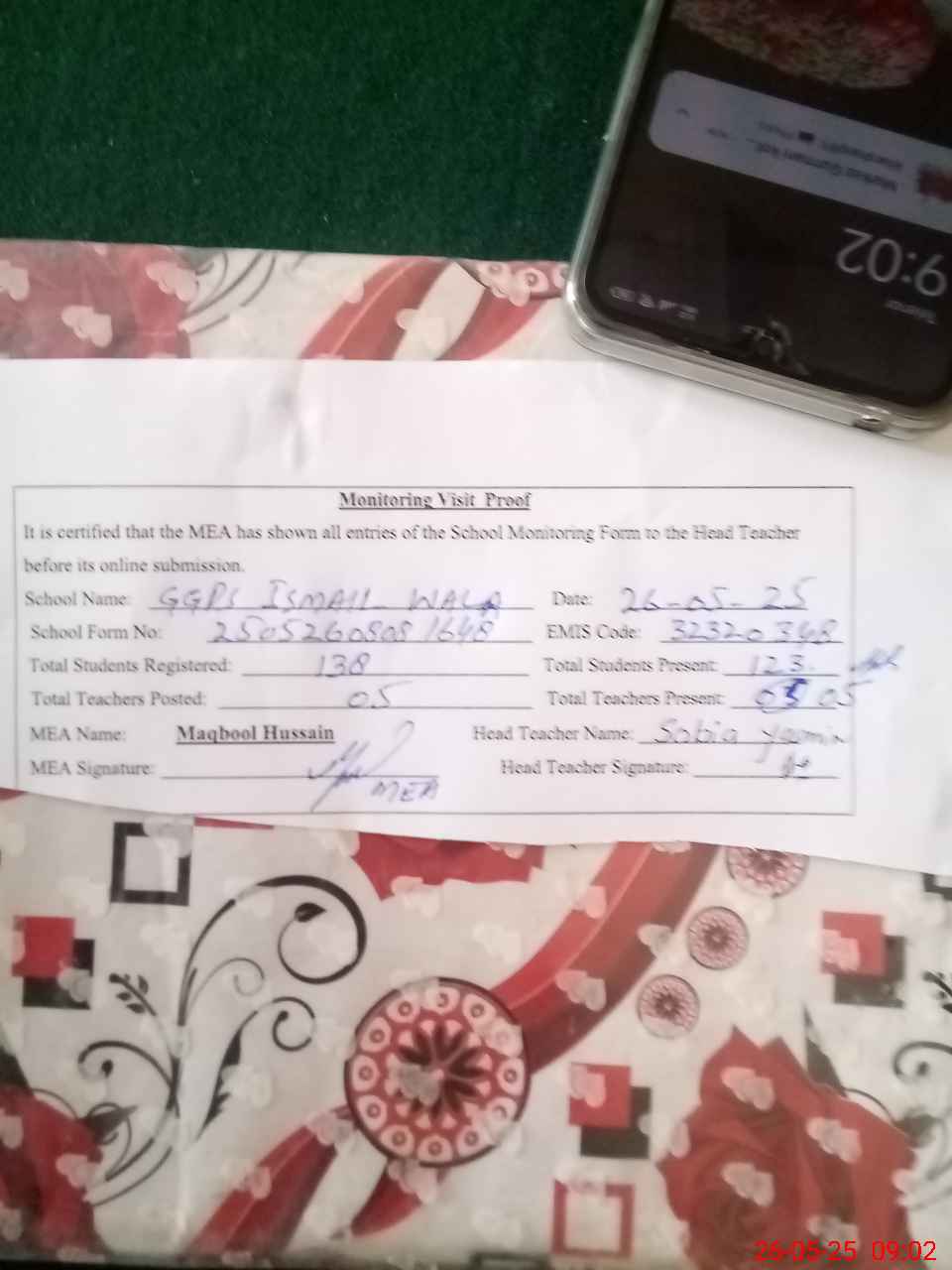 | Attendance Register | Head Teacher | MEA with School | Visit Proof |