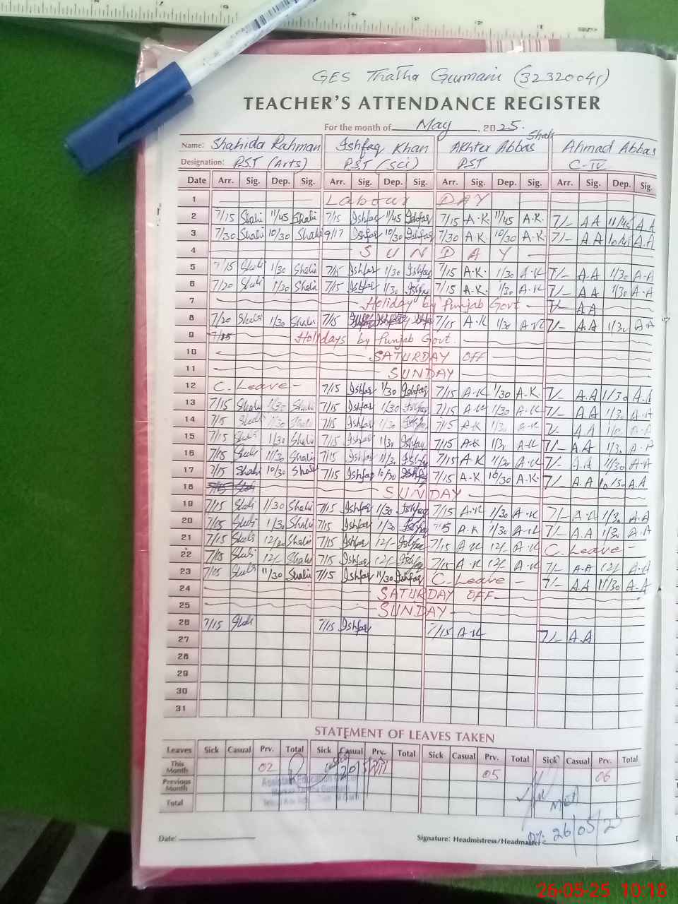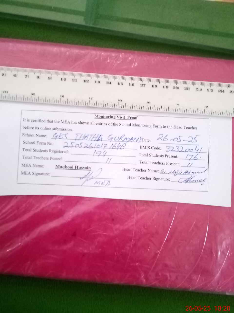 | Attendance Register | Head Teacher | MEA with School | Visit Proof |
