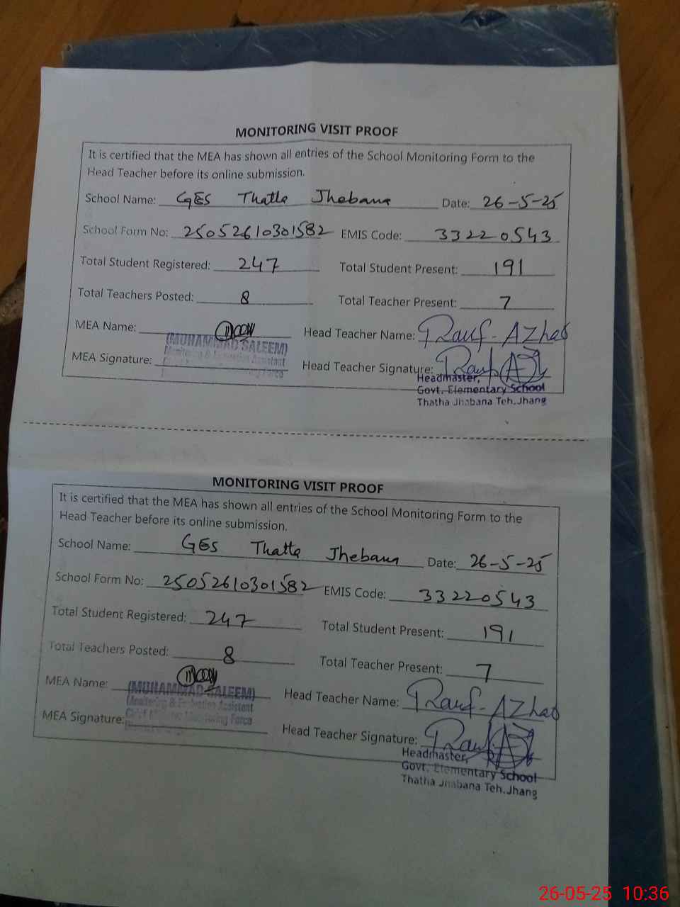 | Certified that this School was Inspected by the Undersigned MEA/DMO Today and the Information Stated Above is as Per Record. | |||||